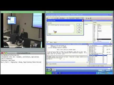 The class materials are available at http://www.OpenSecurityTraining.info/IntermediateX86.html Follow us on Twitter for class news @OpenSecTraining. The playlist for this class is here: http://bit.ly/HIaD4O The full quality video can be downloaded at http://archive.org/details/opensecuritytraining Building upon the Introductory Intel x86 class (playlist: http://bit.ly/IILMeN), this two-day class by Xeno Kovah goes into more depth on topics already learned, and introduces more advanced topics that dive deeper into how Intel-based systems work. Topics include, but are not limited to: *Physical and virtual memory and how a limited amount of physical memory is represented as much more virtual memory through a multilevel paging system. We will also talk about memory segmentation. *The hardware basis for kernel versus userspace separation and how software transitions between the two. This portion answers the question of why does x86 have 4 "rings", with ring 0 being the most privileged, and ring 3 being the least. *Hardware and software interrupts, and how they are the basis for debugging. *Input/Output instructions and how these allow the CPU to talk to peripherals. Example applications include showing how hardware and memory mechanisms are used for software exploits, anti-debug techniques, rootkit hiding, and direct hardware access for keystroke logging. This material includes labs on: *Using WinDbg to perform kernel debugging on a virtual machine (which is equally applicable for debugging a real machine.) *Using a custom WinDbg plugin to examine the Local (memory segment) Descriptor Table (LDT), and Global (memory segment) Descriptor Table (GDT) in order to understand how Windows sets memory segment ranges and permissions for userspace and kernel space. *Using WinDbg and the !pte command to understand how Windows organizes its paging structures which map physical memory to virtual memory. *Investigating where exactly the XD/NX bit is set in order to make memory as non-executable (which Microsoft calls Data Execution Prevention (DEP)), to prevent some types of exploits from succeeding. *Using the Read Timestamp Counter (RDTSC) instruction to profile code execution time. Also, using a profile of code execution time to change a program's behavior in the presence of a debugger (e.g. executing different code if the code appears to have been stopped at a breakpoint.) *Printing information about task state segments, which hold information that is used to find the kernel stack when an interrupt occurs. *Watching what does and doesn't change when a software interrupt is used to transfer control from userspace to kernel. *Reading the Interrupt Descriptor Table (IDT) and understanding the security implications of changes to it. *Understanding how RedPill uses the IDT in order to detect that a system is virtualized. *Having a process read its own memory when a software breakpoint is set, in order to see how a debugger will change memory to set the breakpoint but hide the change from the user. *Watch how hardware-based breakpoints manipulate dedicated debug registers. *Using port input/output to access the backdoor communications channel that VMWare uses in order to send copy/paste, mouse movement, and other events in and out of a VM. *Using port I/O in order to talk directly to the PS2 keyboard controller in order to sniff keystrokes or flash keyboard LEDs. Knowledge of this material is strongly encouraged for future classes such as Rootkits (playlist: http://bit.ly/HLkPVG) where we talk about IDT hooking for instance.