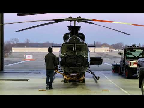 This is one way we move our helicopter in and out of our hangar. Our current helicopter fleet has skid landing gear instead of wheels. This means we either have to use a electric/hydraulic powered cart to lift and move the helicopter or land the helicopter on a platform that can be towed by a tractor. We have a video of that also in this channel. #helicopter #towing #tug #aviation
