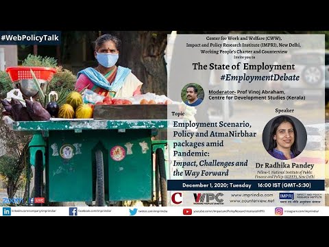 On behalf of the Center for Work and Welfare (CWW) at IMPRI and Counterview, we invite you for IMPRI #WebPolicyTalk - The State of Employment, #EmploymentDebate. Details of the #WebPolicyTalk: Topic: Employment Scenario, Policy and AtmaNirbhar packages amid Pandemic: Impact, Challenges and the Way Forward Date: December 1, 2020; Tuesday Time: 16:00 IST (GMT+5:30) Platform: Zoom and Facebook Live Speaker: Prof Radhika Pandey, Fellow-I, National Institute of Public Finance and Policy (NIPFP), New Delhi Moderator: Prof Vinoj Abraham, Professor, Centre for Development Studies, Kerala Event Page: https://www.impriindia.com/event/employment-scenario-policy-and-atmanirbhar-packages/